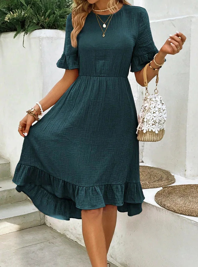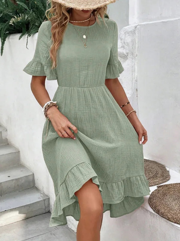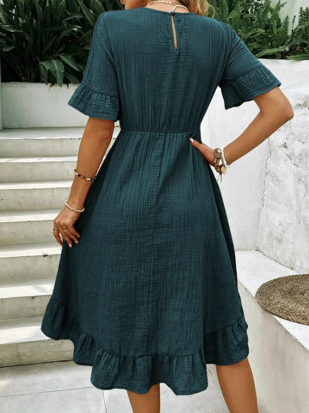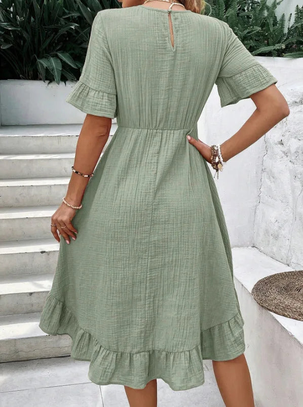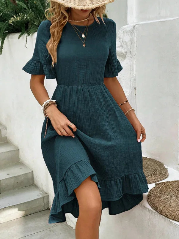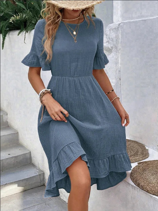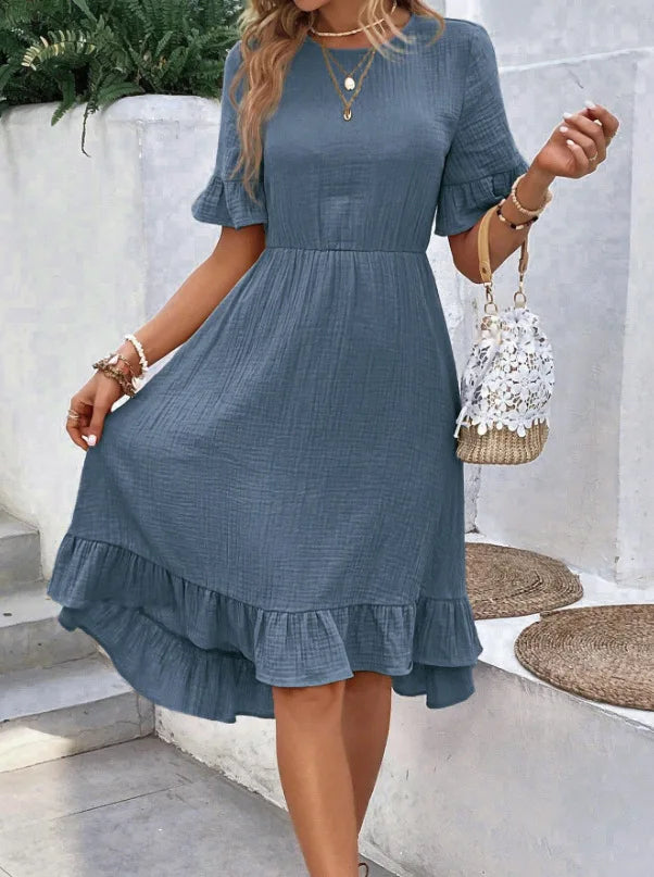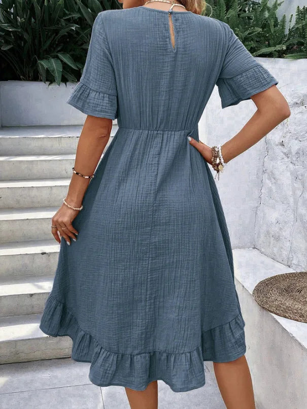 Il design con scollo rotondo e maniche corte dona un look semplice ma raffinato, mentre la gonna fluida con inserti e balze aggiunge movimento e un tocco femminile irresistibile.