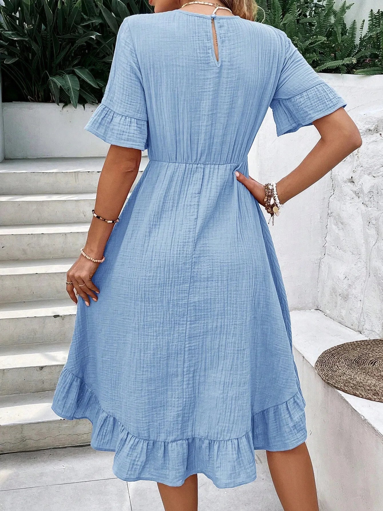 La parte superiore è caratterizzata da uno scollo rotondo essenziale, che mantiene uno stile pulito e versatile, facilmente abbinabile a collane o accessori estivi. Le maniche corte con delicati volant aggiungono un tocco romantico e leggermente boho, donando movimento ad ogni gesto.